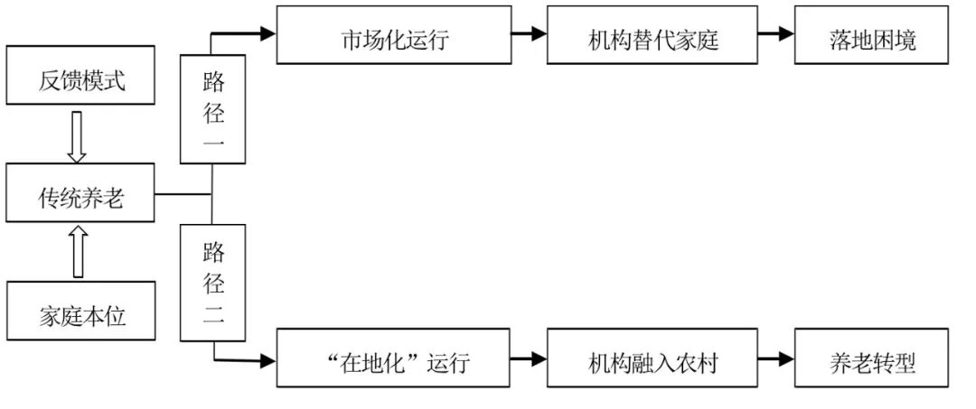 在城镇化等外部因素的影响下,农村留守老人、空巢老人现象日趋普遍,人口老龄化和家庭少子化进一步增大了农民家庭养老压力。考虑到家庭养老在功能上逐步弱化的现实情况,中国亟需探索一套符合农村实际的机构养老服务供给模式,找到农村养老机构持续发展的办法,探索与农民家庭需求相匹配的服务供给方式,在发展定位、服务内容、布局导向、经营规模、主体培育等方面充分考虑农民家庭的养老需求和农村社会实际。 (一)发展定位:明确机构养老与家庭养老、农村社会的关系 农村机构养老的发展定位包括两个方面。 首先,要明确机构养老与家庭养老的关系。 在社会化养老服务体系中,机构养老的定位是弥补家庭养老的不足,而不是完全替代家庭养老。机构养老的作用在于:实现与家庭养老的功能互补与融合发展,通过机构与家庭的合力来创造新的养老秩序,降低家庭转型对老年人的冲击和伤害。 具体来说:一是在价值方面,应明确家庭养老的基础性地位。“无论是发达国家还是发展中国家,在老年人生活中,家庭始终是一个中心话题”(姚远,2001)。在可预见的时期内,家庭养老仍在养老体系中处于基础性地位,因此,应重视发挥家庭养老的价值,确保机构等外部力量的进入是在增进家庭价值,而不是消解家庭价值。 二是在分工方面,实现不同社会主体的高效合作。农村未来新的养老形态依赖于家庭养老与机构养老的深度协作,这要求充分发挥不同养老主体的优势,重视养老主体之间的合理分工,使不同养老资源走向互补与融合。 三是在规则方面,确保机构养老是在维护家庭养老规则。机构养老是在强化农民家庭代际支持能力,提高老年人福利而不是将老年人排斥出家庭。现阶段,以养老机构为代表的社会力量进入农村养老领域,其对家庭养老的补充功能在于:让被现代化转型吸纳的农民,在家庭养老之外多一种养老选择,让老年人在人生后期有尊严地老去,缓冲家庭功能变化对老年人生活的直接冲击,防止养老问题进一步扩大化。 农村机构养老发展的路径 其次,要厘清机构养老与农村社会的关系。 持续有效的机构养老服务一定不是封闭在特定环境之中的专业养老行为(李永萍,2021),而是超越了其内部视野,建构起自身与社会情境的内在关联,实现机构养老在农村市场的落地生根。换言之,机构养老不能悬浮于农村社会之外,而是需要嵌入农村社会。 养老机构的嵌入性具有两重含义:一方面,养老机构要在服务水平、服务内容和服务方式等方面适应农村社会的需求,探索具有农村特色的养老服务供给方式。另一方面,养老机构要主动融入农村社会,充分利用“熟人关系”“人情互助”“亲属网络”等一系列非正式养老资源来弥补自身的天然不足。通过调动社会资源发展“在地化”的养老机构,其本质是积极地援引社会力量和传统养老资源来应对农村养老现实问题,让老年人“在熟悉的家庭和社区获得连续性、综合性的服务”(宫伟瑶,2015)。农村机构养老发展应当避免图2中“路径一”所出现的“落地困境”,而应探索“路径二”所显示的发展方向。 (二)服务内容:提供低成本、基础性的养老服务 农村的经济社会发展相对滞后,在农民大量进城且农民家庭经历现代化转型的背景下,有限且低水平的代际反馈将长期存在。农村社会的特殊性决定了养老机构在服务内容上需与农民家庭的发展阶段、养老资源以及农村经济发展水平相适应。农民家庭有限的养老支付能力限制了养老机构提供服务的内容和层次,养老机构的供给水平在短期内无法实现大的跨越。上述条件决定了农村机构养老服务低成本、基础性的特征。 当前农村养老除了受城镇化、人口老龄化等宏观因素影响外,还受到农民家庭生活方式转变的影响,例如,农村青壮年劳动力外出务工造成老年人缺乏照料。农民所期待的并不是遥不可及的养老产品,而是就近便捷、物美价廉、便宜实用的服务,以满足收入不高的老年人在吃、穿、住、就医、应急等方面的基础性需要。 养老机构提供的基础性服务具有双重保底的作用: 首先,为农村老年人的基本生活保底。农村老年人是家庭现代化转型之痛的主要承担者,养老机构要为老年人支撑起日常生活秩序,填补家庭养老的功能缺位。 其次,为家庭发展保底。随着城镇化的不断推进,农民日益被卷入进城大潮中。城镇化重塑了农民的生产生活方式,对长期外出务工或者奋斗进城的农民来说,妥善安置好老年人相当于解决了家庭的后顾之忧。机构养老在一定程度上克服了空间脱域所产生的日常照料难题,契合现阶段农民家庭发展要求。 因此,向农村延伸的养老机构应提供低层次但有效的服务,让入住其中的农村老年人获得不低于家庭所能提供的生活照料和主观体验。 (三)布局导向:实现机构养老服务的均衡覆盖 优化空间布局是提高农村机构养老服务供给效率的关键所在。绝大多数地区的农村老年人分布比较分散(王红霞,2019),规划农村养老机构布局应以老年人口的实际分布状况为参照。除了考虑交通便捷性因素外,老年人倾向于选择离子女居住地较近的养老机构(戴维等,2012)。 在选址方面,养老机构的布局应以乡镇或者中心村为原点,确保其服务覆盖周边村庄。其合理性在于:新建立的养老空间与当地的社会交往空间、市场空间、行政空间高度同构,具有很强的