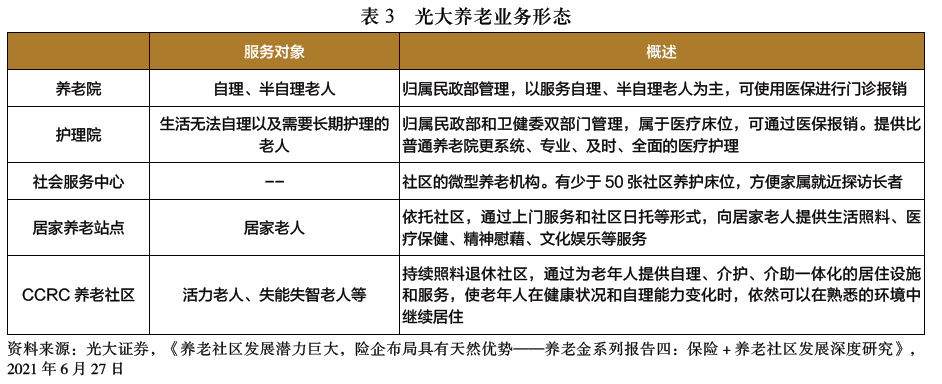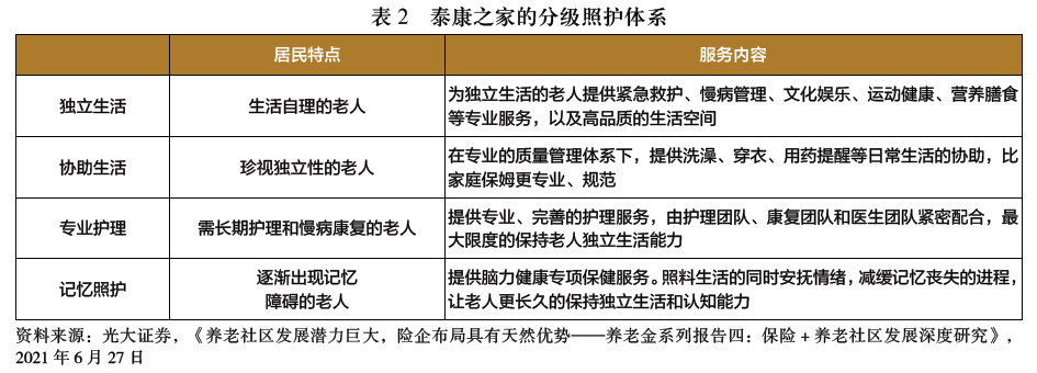 各家险企旗下的养老项目大致分为两种,一种是险企投资自建,另一种则是与第三方合作纳入旗下,一般来说,自建养老社区所需资金投入额更大,据此,险企对于养老社区的投资模式可分为如下三种:重资产模式、轻重资产相结合的模式以及轻资产模式。 1.重资产模式 重资产模式指依托集团的资产优势投入资金自建养老社区项目,这种模式取决于公司的资产规模,保险公司的角色往往是“投资商、开发商、运营商”合为一体。典型模式是泰康、太保、国寿、新华等。 泰康人寿是国内最早探索投资养老社区的保险公司之一,泰康之家是其养老、护理、康复实体建设运营和创新服务的主要载体,采用重资产运营模式,旗下项目均为自建自营。泰康之家将养老社区与康复医院对接,在养老社区配建康复医院,为长辈提供覆盖老年人全生命周期的一站式健康服务(见表2)。 泰康人寿在重资产投资模式下前期同时扮演投资商、开发商角色,后期则进入运营商角色。该模式下,泰康人寿一方面对旗下养老社区项目控制力度较大,产权关系明确,另一方面也能凭借其雄厚的实力打造从养老理财到医疗、保健、文娱等养老服务的全方位养老产品,实现企业的人文关怀,提高产品竞争力。但重资产投资模式对保险企业自有资金投入要求较高。 养老社区作为高投入、缓收益的大型土木建设工程项目,不仅需要险企在前期能够快速投入大量资金用于开发建设,还为险企带来了较长的盈利周期,要求其中短期内不能出现流动性风险。因此,重资产模式虽自主程度高,但也为险企长期发展运营带来了挑战。 2.轻资产模式 轻资产模式即全部与第三方合作的模式,通过第三方现成的养老床位数来实现资源互换,典型代表为光大养老与光大集团旗下光大汇晨、光大金夕延年等养老品牌展开合作。 以光大养老为例,其在投资模式方面以轻资产为主。在运营模式方面,光大养老主要分为四个板块,分别为公建民营、租赁物业、委托管理以及养老项目的全程咨询与顾问服务。 目前光大养老拥有养老院、护理院、社区养老机构、居家养老站点、CCRC五大养老业态(见表3),轻资产模式对保险企业自身资金实力要求不高,整体成本较低,因此轻资产模式下的养老服务社区能够快速覆盖国内多个重点城市,并能在较短时间内投入运营使用,实现盈利。 此外,相对泰康之家等重资产模式高端养老社区,光大养老社区等轻资产养老社区的起步费用较低,客群相对广阔。例如,“光大安心养老计划”所对接的养老社区30万元即可享受旅居养老服务,且可对接光大旗下的年金保险和终身寿险产品。但轻资产模式下与第三方合作打造养老社区的方式一定程度上会带来产权不明确,保险公司控制较弱等问题,这对保险公司运营质量以及利润分成带来了考验。同时,由于与第三方合作存在一定破灭的可能性,相关项目的长期可持续性难以得到保障。 3.轻重资产相结合的模式 轻重资产相结合模式指部分养老社区自建,同时与第三方签约合作或者以股权投资养老机构。轻重资产相结合的投资模式允许险企在保留自建高端养老社区的情况下,以收购、租赁等方式快速进行产业布局,扩大养老社区服务覆盖面,典型代表为太平、合众等险企。 中国太平集团采用轻重资产相结合的模式建设养老社区,即部分养老社区项目自建,同时与第三方签约合作或者以股权投资养老机构。合众优年为合众人寿旗下采用重资产+轻资产混合模式实现养老服务业务布局的品牌。目前,合众优年拥有武汉、沈阳、南宁三家重资产模式自建的养老社区,并同时在轻资产模式下,以股权投资的方式收购国内外养老社区或机构,快速布局养老产业,形成全国范围内连锁经营。 4.“轻重并举”模式或将成为首选 将三种投资模式进行比较:“重资产”模式产权关系明确、资产增值部分可弥补甚至提升项目整体损益,但面临着造价成本高、盈利周期长的挑战;而“轻资产”模式的成本较低、盈利周期较短、盈利路线明晰,但产权归属不够明确、与第三方的合作关系不够稳固。“轻重并举”模式结合了二者优点,兼具成本低、布局速度快、盈利周期短、产权关系明确等优势。因此,“轻重并举,先重后轻”的发展路径或将成为未来险企布局养老产业的首选。